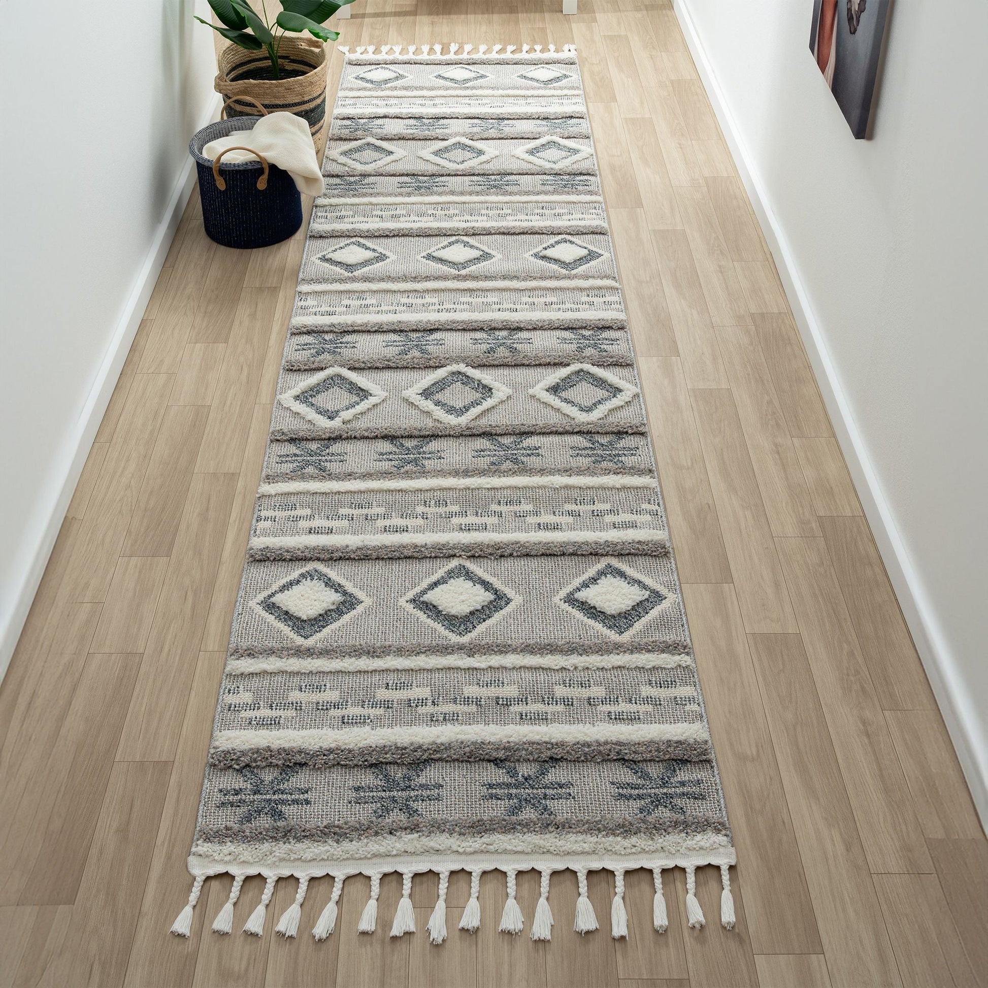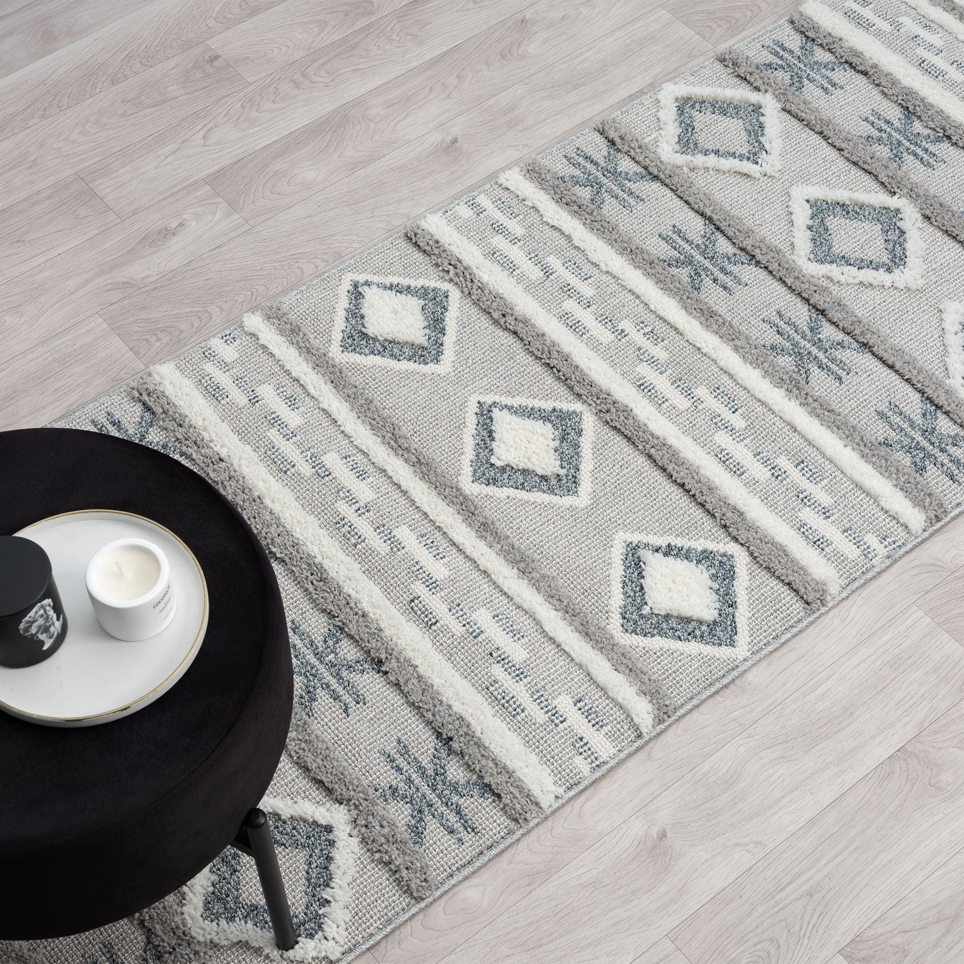 This quaint and cozy collection, with its minimalist style designs, is made from soft polyester and polypropylene, and has a high-and-low, cut and loop pile ranging from 8 to 28 mm. in height. The harmonious colour scheme used in this fashionable collection is complemented with versatile geometric motifs, power loomed into a durable cotton and jute base and finished with braided fringes. This highly decorative range also has shed-resistant and anti-static properties, and is easy to maintain.